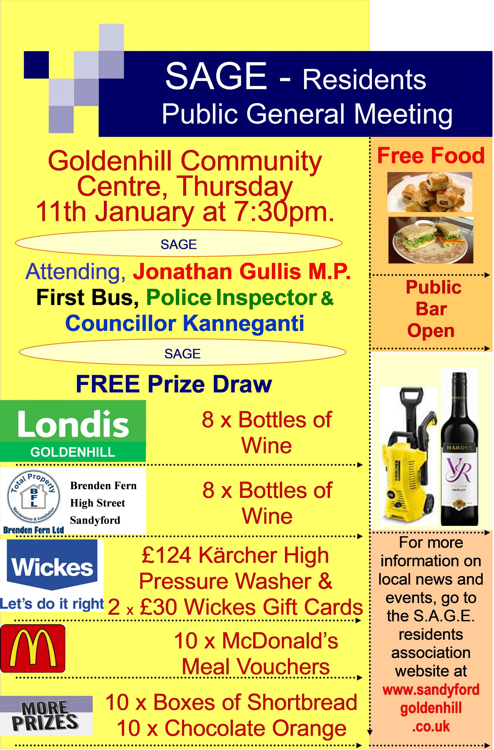 For the next Sandyford & Goldenhill Public Meeting being held on Thursday 11th January, we have agreed the attendance of Jonathan Gullis M.P. First Bus, Councillor Chandra Kanneganti and Police Inspector Hayley Eaton.