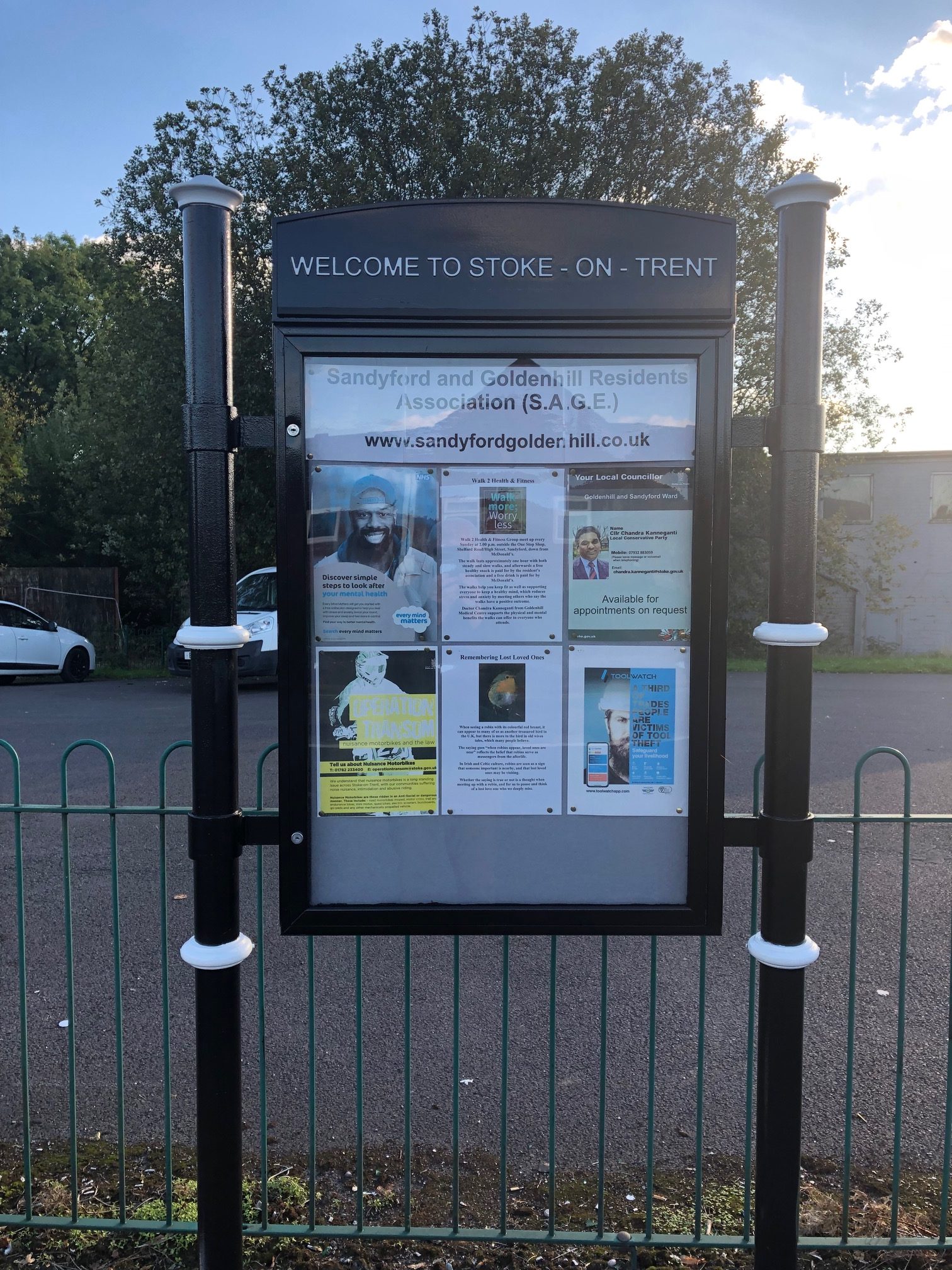 Sandyford & Goldenhill Residents Association get its long awaited public noticeboard refurbished, which is located next to the free shoppers car park in Goldenhill.